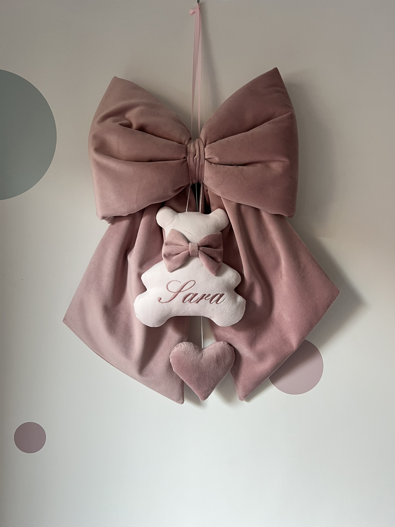 Per questo modello di fiocco nascita sono previsti sino a 3 pendenti, sempre personalizzabili nei colori e forme. La personalizzazione del nome viene eseguita con il ricamo.